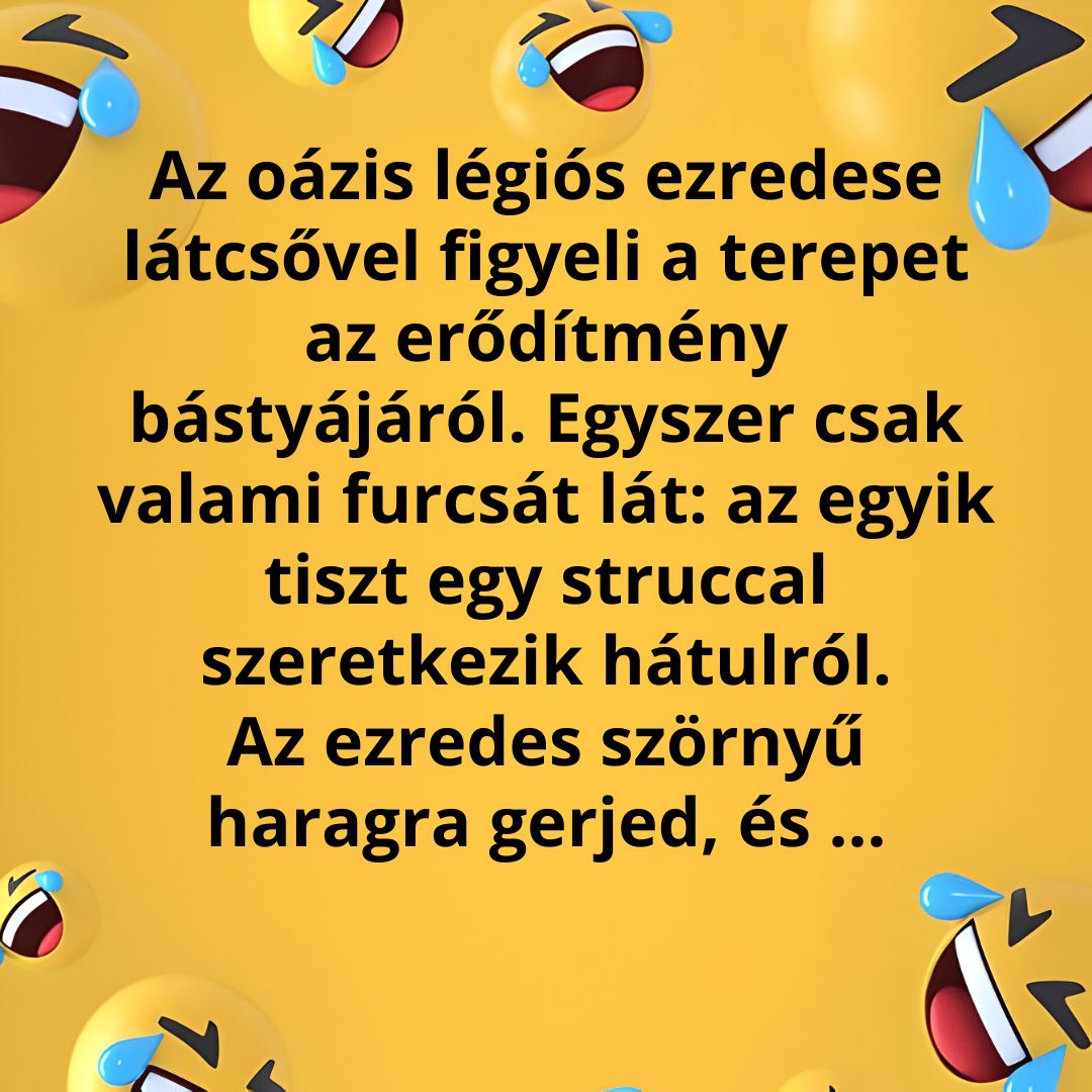 Vicc a hadnagyról, akit észrevesz az ezredese, amint épp egy struccal ügyködik.