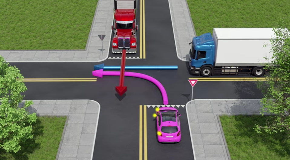 A kereszteződésben három jármű várakozik, amelyeknek biztonságosan át kell jutniuk a másik oldalra.
