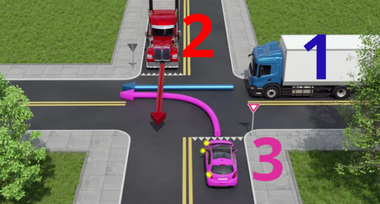 A piros kamion és a rózsaszín autó előtt „Elsőbbségadás kötelező” tábla található. Minden sofőrnek tudnia kell, hogy a kereszteződésben ezzel a táblával ellátott autóknak figyelniük kell és elsőbbséget kell adniuk az áthaladó járműveknek