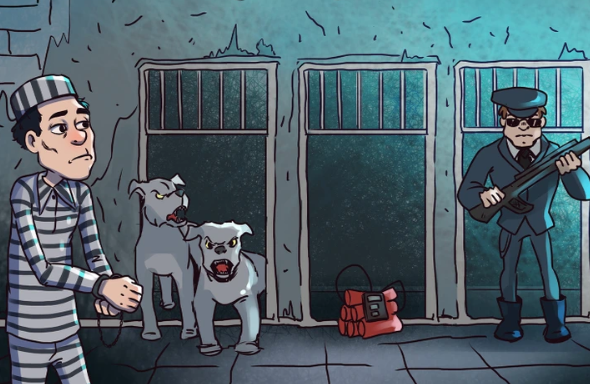 Három menekülési kijárat van, amelyeken keresztül a bűnöző kijuthat a börtönből. Az első kijáratnál agresszív kutyák vannak. A második ajtónál egy 5 perces időzítővel ellátott bomba található (már be van kapcsolva). A harmadik kijáratnál egy fegyveres őr áll. Melyik ajtón keresztül juthatna ki a bűnöző biztonságosan a börtönből?