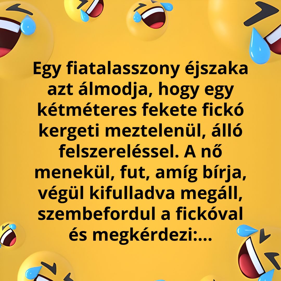 Vicc a fiatalasszonyról, akit egy nagydarab fickó üldöz az álmában.