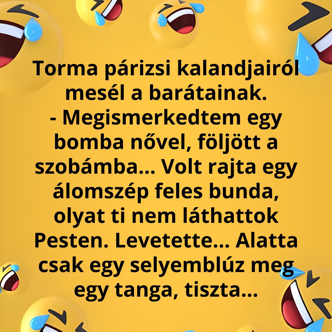 Vicc a férfiról, aki párizsi kalandjairól mesél a barátainak.